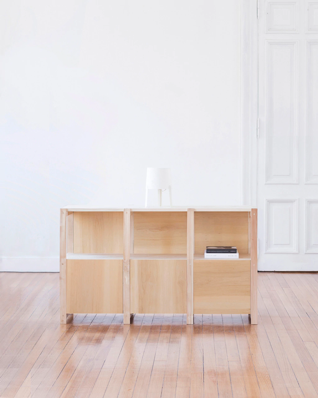 Combina guardado cerrado con estantes abiertos, adaptándose a diferentes usos: cómoda, recibidor, biblioteca baja o divisor de ambientes.